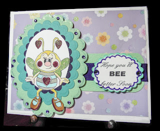 Build a tent-style card in purple, aqua and light green is the Challenge for the second week at Joan's Gardens. The adorable bee is a digistamp (colored with Copics) by Wendy Hall at Louby Lou Designs. The dies are Spellbinders Scalloped Ovals. Spellbinders dies are available at Joan's Gardens The background paper is from DCWV's Glitter Mat Stack. Besides Hope you'll Be Better Soon sentiment, I created BEE good, and some other ones with BEE in them. The purple rhinestones are by Studio G (Walmart). LIghtly accented with Stickles Diamond, also available at Joan's Gardens.