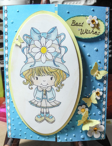 This gate-fold card is embossed with Sizzix 658285 Textured Impressions embossing folder "Dots Set." I've used copics and Tim Hotz Distress Markers to color little Dolled Up Miss Daisy from the Flower Power collection by Wendy Hall. The Butterflies are SU Embosslits, Beautiful Wings, and the white and gold ringed edge detail and Best Wishes sentiment are by Starform available at Pop Ups Etc. The oval and matting were cut from Lifestyle Crafts oval dies. The little rhinestone centered white flowers are commercial. I used Sakura's Glaze pens on the daisy on her hat.