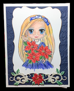 Winter Alyssa was just SO much fun to do for the November Progressive Challenge Art by Miran's facebook album. The sweet silver haired Alyssa is mounted on royal blue foil paper, accented with diamond snowflakes. She's finished in prismacolor pencils, and touched with wink of stella and Glistening snow-writer. The edges of the artpiece are distressed and inked with acrylic paint and snowriter. This is one of my favorite progressives and one of my favorite cards for this Holiday season.