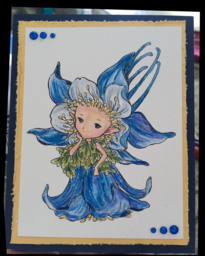 This precious little blue Columbine Sprite drawn by Mitzi Sato-Wiuff (Aurora Wings) tells the story of her namesake. Columbines come in a wide variety of colors one being the true blues. She is colored in Prismacolor pencils and touched with Liquid Pearls. She is created for the Aurora Wings Blog Challenge #31, My favorite Color. Dark and Light Blue!