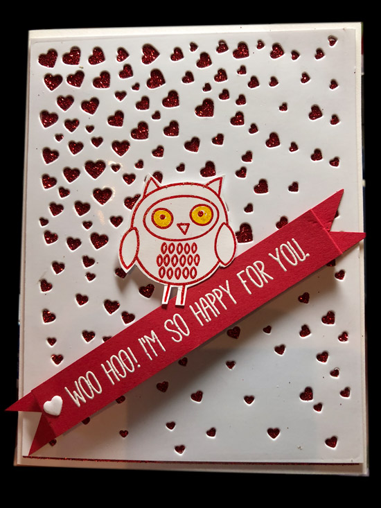 This Line of Hearts is backed with shimmery red ribbon. The cardstock is shimmer spritzed Cherry Cobbler (SU) and the White embossed Sentiment is from SU Sealed with Love stampset. White inlay is from card above. and red inlay above is from this card below.
