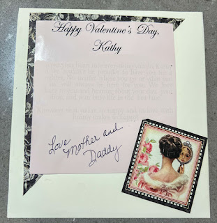 This top Valentine is for daughter Kathy. It is created with Graphic 45 papers "Mon Amour" and follows their tutorial for the front pocket card from the 2023 Vol 1 Card Kit (using papers and elements from 2022 Vol 12 kit.) There is a Starbucks card on the back of the tag that is placed into the pocket. The personal greeting is on the back of this card which does NOT fold out.